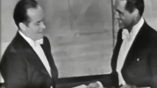 (Jean Simmons aceptó en nombre de Alec Guinness): Aceptar este premio para Alec Guinness esta noche me proporciona un placer muy particular porque hace 13 años yo trabajé con Alec en una película llamada “Cadenas rotas” y tuvimos la suerte de tener como director a David Lean, que también ha dirigido “El puente sobre el río Kwai”. Desde entonces yo le visto en maravillosas interpretaciones. Por eso esta noche, dedico esto a Alec Guinness, un verdadero y genial artista, muchas felicitaciones. Y en su nombre, yo agradezco a la Academia. Gracias.